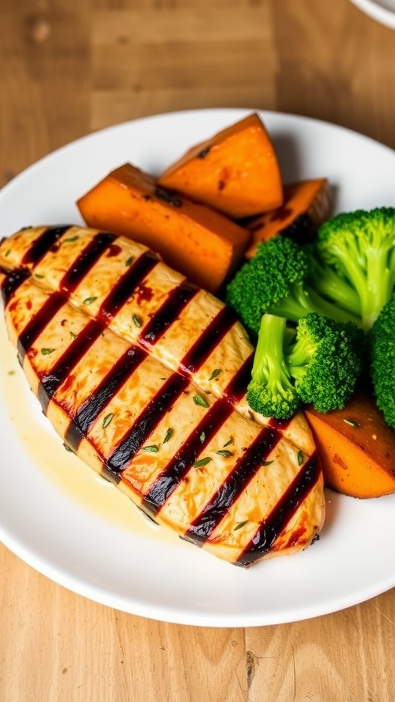 A wholesome dish featuring grilled chicken breast, sweet potatoes, and broccoli.