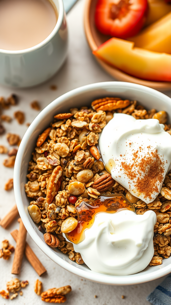 Homemade granola with oats, nuts, chia seeds, and cinnamon, served with Greek yogurt for a wholesome breakfast.