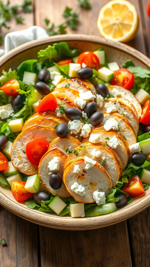 This Mediterranean salad bursts with fresh flavors and textures. The grilled chicken is juicy and tender, while the mixed greens provide a crunchy base. Each ingredient contributes to a dish that is not only appetizing but also healthy.