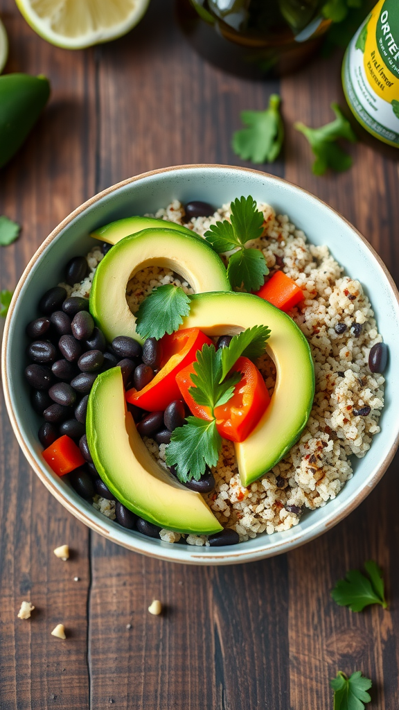 - Mix Ingredients: In a large bowl, combine cooked quinoa, black beans, diced avocado, red bell pepper, and chopped cilantro.